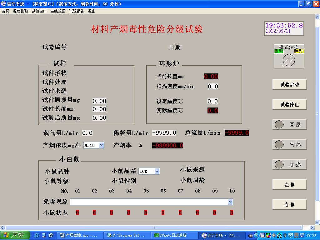 1.4.1.試驗裝置裝置由環形爐、加熱管、樣品舟、煙氣采集配給組件、小鼠轉籠、染毒箱、溫度控制系統、爐位移系統、空氣流供給系統、小鼠運動記錄系統組成。